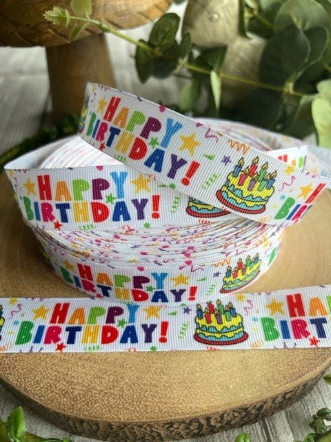 Beautiful Bright Coloured Rainbow Happy Birthday Print Design Grosgrain Ribbon