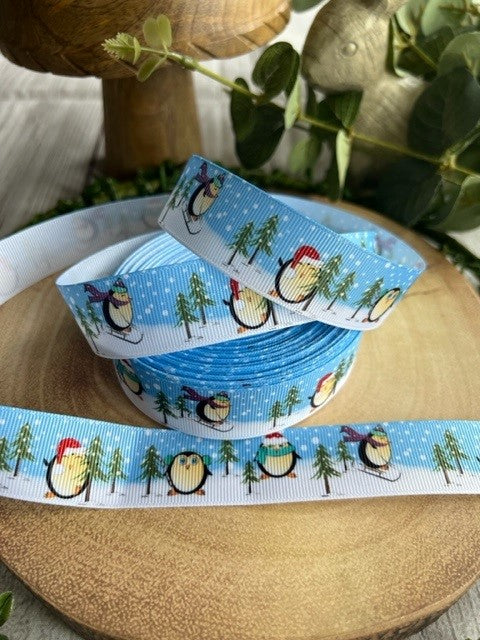 Beautiful Bright Christmas Penguins & Trees Design Grosgrain Ribbon
