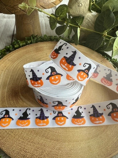Beautiful Bright Halloween Pumpkins in Hats Print Design Grosgrain Ribbon