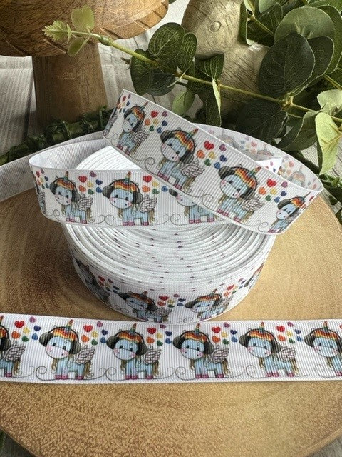 Beautiful Bright Coloured Rainbow Unicorn & Headphone Hearts Print Design Grosgrain Ribbon