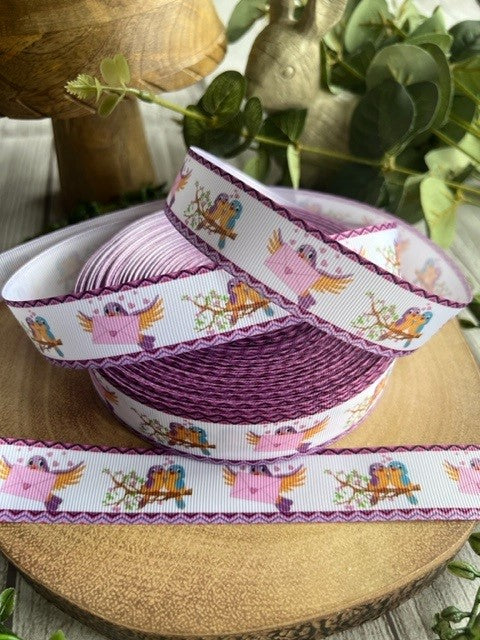 Beautiful Purple Pastel Coloured Love Birds Print Design Grosgrain Ribbon